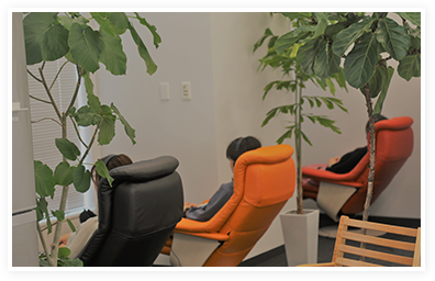 今回新しく、リクライニングチェアーのコーナーを増設しました。休憩時間には、お昼寝をしている社員もたくさんいます。頭をリフレッシュして、もうひと頑張り!